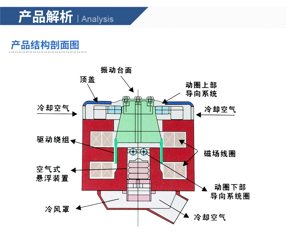 性能特點:●強制風冷 ●正弦激振力范圍: 1kN ~ 70kN●兩倍的正弦沖擊力(2噸以上可選三倍) ●輕質動圈,優(yōu)化設計,耐振性能強●中心氣囊承載能力強,低頻性能好 ●可配置水平滑臺●風機冷卻效果好,噪音低 ●使用頻率可從1Hz開始●隨機與正弦激振力1:1 ●位移峰峰值最大可達100mm●耳軸氣囊隔震效果好 ●雙磁路設計,漏磁低,磁場均勻●正弦、隨機、沖擊等試驗功能 ●高效率、高可靠性功率放大器系統(tǒng)特點:◎一階共振頻率高、使用頻率寬優(yōu)化的動圈骨架結構設計,特別是對傳統(tǒng)結構的動圈骨架傳力角板等薄弱環(huán)節(jié)進行增強設計,有效提高了傳力剛度;采用膠接與螺釘連接的復合固定繞線環(huán)筒和繞線環(huán)筒增強膠孔的新結構,增強了繞組的剛度。顯著提高了動圈的一階共振動頻率,超過了國際同類產品。◎動圈繞組可靠性高獨創(chuàng)的動圈繞組加強環(huán)的新結構和新工藝,顯著提高了動圈繞組工作在大推力、高加速度振動、沖擊和高溫環(huán)境中的耐振可靠性。◎風冷效率高創(chuàng)新的電動臺冷卻風道設計:改進了進風結構,上磁環(huán)用長槽型進風道取代圓孔型進風道;勵磁線圈采用蜂窩式風道、中磁環(huán)采用雙層風流式風道、下磁環(huán)采用斜楔型風道等新結構,顯著提高了冷卻效果。◎冷卻風機冷卻風機具有獨特的風道等結構設計,風機冷卻效果好,噪音低。◎水平和垂直試驗帶水平滑臺的電動振動臺可以用于水平和垂直試驗,兩個方向的切換方式簡單,翻轉方便。◎采用IGBT模塊功放采用性能可靠的MOSFET和IGBT模塊,具有很高的穩(wěn)定性和可靠性。◎安全性能產品符合歐洲標準測試要求,在功放上裝有緊急停止開關,有效應對突發(fā)事件。符合美國UL和CE安全要求。